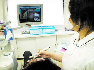 当クリニックでは従来型フィルムレントゲンに比較して放射線被爆線量が少ないデジタルレントゲン院内LANシステムを導入しております。これは従来型レントゲンと比較して1/10~1/4の線量で各種のレントゲン撮影が可能となりさらに薬剤等での現像処理などが必要なくなり、すぐにコンピューターで映像を読み込むので時間的にもスピーディーでまた眼の悪い患者様にもより分かりやすいように大きなモニターでご自身の歯の状態をご覧になれるというものです。