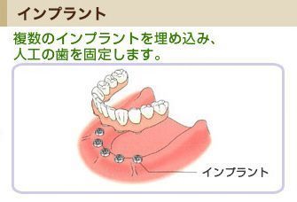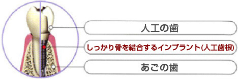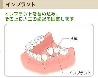 治療方法として歯を失った部分のあごの骨に人工の歯根を埋め込みその上に歯を差し歯のように作るというものです。一見聞くと怖い感じもありますが十分な局所麻酔のもと痛みなく治療が可能です。