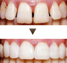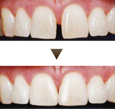 歯の色に合わせてまたは歯より白く特殊な専用樹脂を貼り付けプラズマライトで硬化させて歯と歯の隙間を埋めたり、色合を審美的に回復させる治療法です。